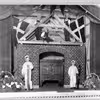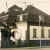 Foto af børn i arbejdstøj foran en opstilling af mur og tagspær i forbindelse med en fest ved Horsens Murer- og Tømrermestreforening.