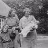 Anna Katrine Kjems Gad og Ellen Gad med Bodil Smidt Hansen på armen i haven ved Østergård