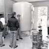 Kollund Vandværk Frederik Clausen med kasketten, Kollund Møbler Sven Nielsen med ryggen til og til højre Lorens Schmidt