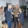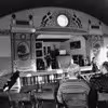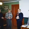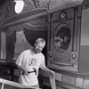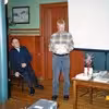 Gørding Forsamlingshus, Knud Riis Andresen med værktøjskasse. Se restaurerede scenetæppe.