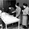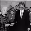 Julekomsammen i Trinitatis Sognegård Bordene er dækket med kaffekopper, og et juletræ er tændt i hjørnet. Gitte Nielsen, bestyrer af sognegår- den står ved et bord med gevinster. Formentlig medlemmer af gamle Frede- ricia minder. 8 stk. Bill