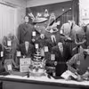 Tre mænd kigger på tøjdyr ved en stand, ca. 1945