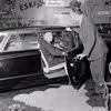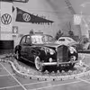 Eigil Rasmussen i bil på biludstilling i Badmintonhallen, marts 1960