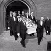 Fhv. borgmester A. P. Brandholts kiste bæres ud af kapellet, september 1948