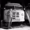 En piberygende pastor Eilif Krogager foren en af sine busser, februar 1960