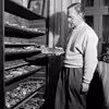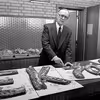 Pastor Eilif Krogager med en flinteøkse i hånden, februar 1960