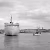 Der arbejdes på at få M/F Winston Churchill til kajs, 1970
