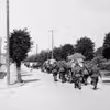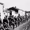 Tyske soldater marcherer langs sønderskudte bygninger, 1940-45