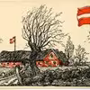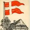Tegning af en rødmalet gård, hvor Dannebrog vajer