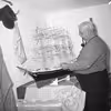 Portræt - fhv. fisker Claus Henrik Hansen Dvinge (1873-1956) bygger modelskib, Bredballe, 1954
