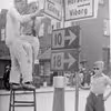 Opsætning af nye vejskilte, krydset Kirkegade / Dæmningen, Vejle, 1938