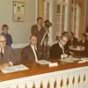Kommunesammenlægning, pressemøde i byrådssalen, Vejle Rådhus, 1970