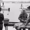 Fiskerne renser deres fisk på stranden ved Gl. Ålbo.