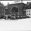 Torvet med parkerede biler set fra det gamle rådhus. I forgrunden taxaholdepladsen