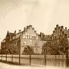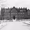 De Gamles Hjem opført 1911. Silkeborgs første alderdomshjem i sne. I forgrunden kælkende børn