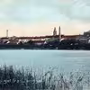 Udsigt over en isbelagt Silkeborg Langsø mod bebyggelsen på Sølystvej