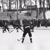 Ishockeyspillere i kamp på Silkeborg Skøjteløberforenings bane med Lunden i baggrunden