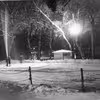 Der sprøjtes vand på skøjtebanen ved Lunden med tændt lysanlæg. I baggrunden ses 'klubhuset', der tilhørte Silkeborg Skøjteløberforening