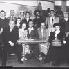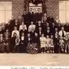 Guldbrudeparret Kirsten Marie Rasmussen og Rasmus Hansen Sørensen fotograferet med deres gæster udenfor Søften Forsamlingshus, 8382 Hinnerup