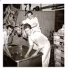 Lærlinge vasker svinehoveder i saltvand paa Lemvig Svineslagteri, Forrest Karl Sønderby Hansen ,bagerst Niels Stenstrup, Ramme, til venstre, Jens Mathiasen, Lemvig.
