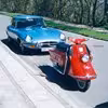 Strandvejen med to biler og anlægget med et lille lysthus.