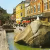Torvet og Centralgården. I forgrunden springvand / Eigil Westergårds vandkunst med stor sten.