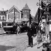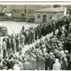 To rækker af mennesker venter på et optog(?) ved rådhuset og Lemvig Rutebilstation under befrielsen.