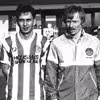 Fodbold. Horsens Forenede Sportsklubber (HFS). Træner Rolf Hjernøe iagttager spillet sammen med to af klubbens profiler i 1982.