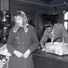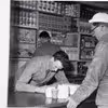 Fabjerg Brugsforening; kommis Arne Nørgaard og Jens Møller Villesen, med ryggen til ved hylderne Poul Degn, 1950 - 1960
