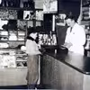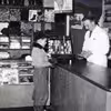 Fabjerg Brugsforening; kommis Arne Nørgaard og Jens Møller Villesen, med ryggen til ved hylderne Poul Degn, 1950 - 1960