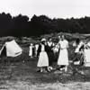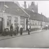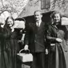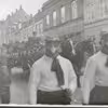 Kontorpersonalet fra Grenaa Dampvæveri på vej over til fabrikken med løn i spånkurvene.