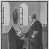 Dreng hilser på mand i kirken. Tegning af Poul Steffensen.
