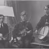 3 drenge med musikinstrumenter, 2 med violin og en med lilletromme. Ry.