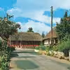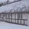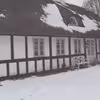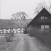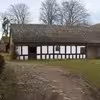 Gårdbillede med hovedbygning i bindingsværk og med stråtag ved Ry.