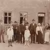 En stor familie med tilknytning til Ry poserer foran en bygning.