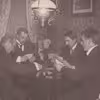 Fire mænd spiller kort i en stue i Ry.