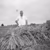 Boelsmand Karl Jacobsen henter korn ved halmstakken på marken. Rensløkke, Lyngvej 3.