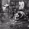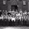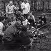 Børn og voksne fra Indre missions børneklub bager snobrød med pølser i haven bag "Nain", Vesterskovvej 27.