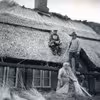 Stråtækning af Bækkevej 2, Galten. Forrest ses Martha Jensen. De øvrige personer er ukendte.