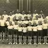 Stjær gymnaster til gymnastikopvisning i Stjær forsamlingshus 1943. Personerne er ukendte. Foto: 1943. Fotograf er ukendt.