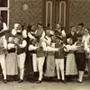 Stjær folkedansere uden for Stjær Forsamlingshus.