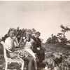 3 elever siddende på en bænk i naturen. Nedenfor sidder en del andre børn.
