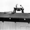 To tømrere arbejder med ventilationsskakten på taget af en bygning i Grovelejren