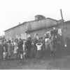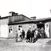 Flygtninge i Grovelejren foran en af barakkerne