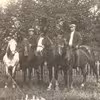 3 ryttere og 5 heste opstillet på et indhegnet græsareal. På jorden ved siden af står yderligere en mand