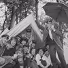 Blommehaven i regnvejr, men folk finder egnet beklædning og tager et spil kort.