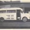 1945 ca Besættelsestiden: De hvide Busser. - Bus med dannebrogsflag, her foran garage i Skive
