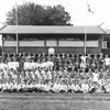 Tilskuere på Skive Stadion, politielever har idræt. I baggrunden ses det røde klubhus. 1944.