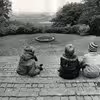3 drenge siddende på trappen op til det nedbrændte Rosenhøj.