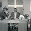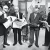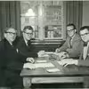 Møde i Skive byrådssal, referenter fra Skives 4 aviser, F/v redaktør H.P. Kristensen, Skive Avis, redaktør Jens Eriksen, Skive Socialdemokrat, redaktør Hans Larsen, Skive Folkeblad og redaktør Peder Jepsen, Skive Venstreblad. Ca.1950.
